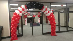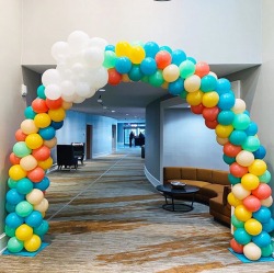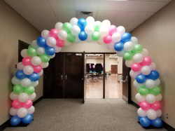 A standard indoor balloon arch can be up to 3 colors with various patterns available. A standard balloon arch is 8ft x 10ft, accommodates a double door entry.