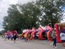 The Circus Football Game is a whimsical blend of athletic thrill and carnival magic. Picture an inflatable football arena, where colors pop and excitement fills the air, beckoning players into a contest of skill and agility. This rental transforms any event into a lively spectacle, inviting friendly competition under the big top’s imaginary canvas. Whether you're aiming for a touchdown or just a good time, the experience is as exhilarating as an action-packed day at the circus. It's fun, it's challenging, and it's a fantastic way to get everyone cheering and playing together. Can go with other circus games as shown in second image. 8x10x13