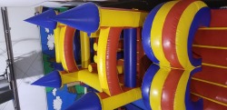 Our Castle obstacle course is fun and challenging! This unique item offers many different types of obstacles to crawl through, up and around as you try to finish the course and conquer a mountain climb and slide. Divide up your friends, youth group, or corporate execs into two groups and before you know it you have a great team building activity. This inflatable requires a regular household outlet. Fun Factory is not responsible for power; however, we do rent generators should you need a power source.