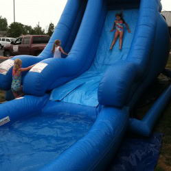 If you are looking for a slip and slide good time at your next party or event, this Blue Water Slide is an excellent choice! Climbing the rungs of the ladder up the left side of the inflatable leads to the top of the slide that is on the right. The slide is covered with a mesh screen at the top, where kids will be getting ready for their turn to 'whoosh' down the slide between protective bumper walls. At the bottom of the slide is a round water pool, so kids can make a splash landing! This fun Blue Water Slide provides endless hours of enjoyment! Available for Tuscaloosa, Northport, Coker, Samantha, Holt, Cottondale, Duncanville, Fosters, Moundville, Buhl, Gordo, Vance, Lakeview, Reform, Bessemer, West Blocton, and surrounding communities.